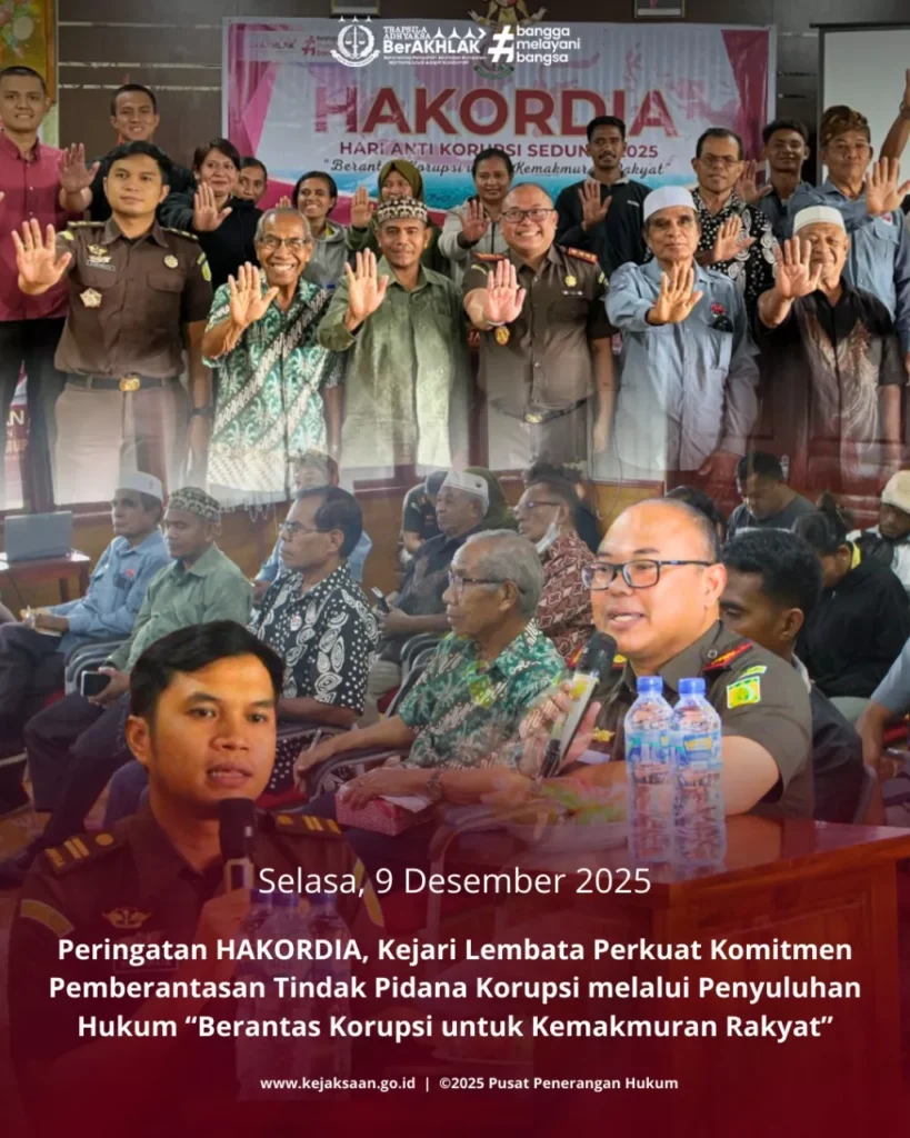 Selasa, 9 Desember 2025, Kejaksaan Negeri Lembata menyelenggarakan Penyuluhan Hukum dalam rangka memperingati Hari Anti Korupsi Sedunia (HAKORDIA) dengan tema “Berantas Korupsi Untuk Kemakmuran Rakyat”. Kegiatan ini dipimpin langsung oleh Kepala Kejaksaan Negeri Lembata Bapak Raden Arie Wijaya Kawedhar, S.H. bersama Kepala Seksi Tindak Pidana Khusus Bapak Yohanes Mangara Uli Simarmata, S.H., sebagai wujud nyata komitmen dalam membangun kesadaran hukum dan meneguhkan semangat anti korupsi di tengah masyarakat.