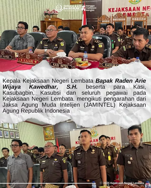 Kamis, 13 November 2025 – Kepala Kejaksaan Negeri Lembata, Bapak Raden Arie Wijaya Kawedhar, S.H., bersama para Kasi, Kasubagbin, Kasubsi dan seluruh pegawai, mengikuti pengarahan secara daring oleh Jaksa Agung Muda Intelijen (JAM Intelijen), Prof. Dr. Reda Manthovani, S.H., LL.M., bertempat di Aula Kantor Kejaksaan Negeri Lembata.