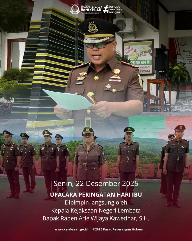 Senin, 22 Desember 2025, Kejaksaan Negeri Lembata melaksanakan Upacara Peringatan Hari Ibu yang bertempat di Halaman Kejaksaan Negeri Lembata. Upacara ini dipimpin langsung oleh Kepala Kejaksaan Negeri Lembata Bapak Raden Arie Wijaya Kawedhar, S.H. serta diikuti oleh seluruh pegawai Kejaksaan Negeri Lembata.