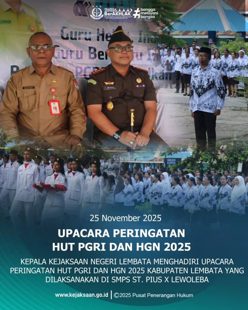Upacara Peringatan HUT PGRI Dan HGN 2025 Leave a Comment / Lain lain / By admin Selasa, 25 November 2025, Kajari Lembata Bapak Raden Arie Wijaya Kawedhar, S.H., Menghadiri Peringatan HUT PGRI dan HGN Tahun 2025 di Kabupaten Lembata.